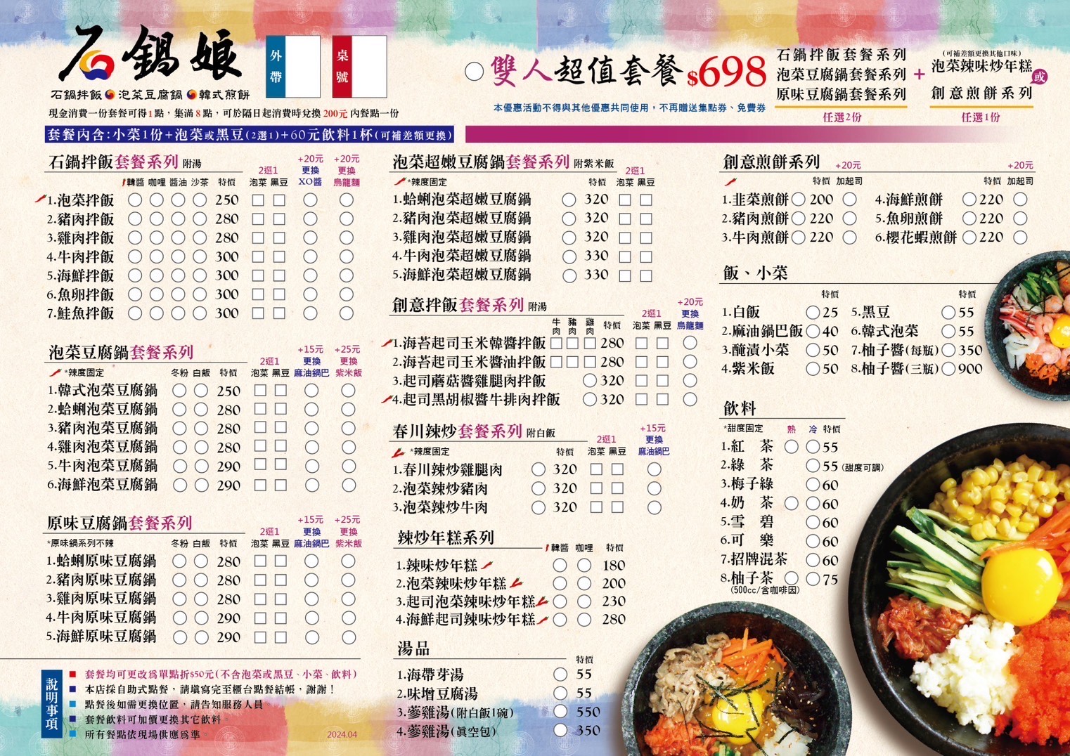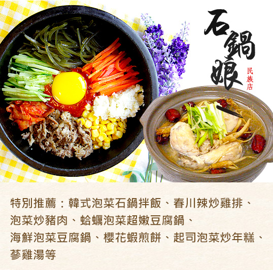 專為國人改良過的韓式美食「石鍋娘」是石鍋拌飯的第一品牌,不僅給予消費者全然不同的異國料理新饗宴,更提供多樣化的美味選擇,豐富的餐點絕對滿足您挑剔的味蕾。
