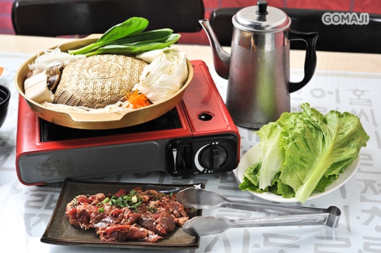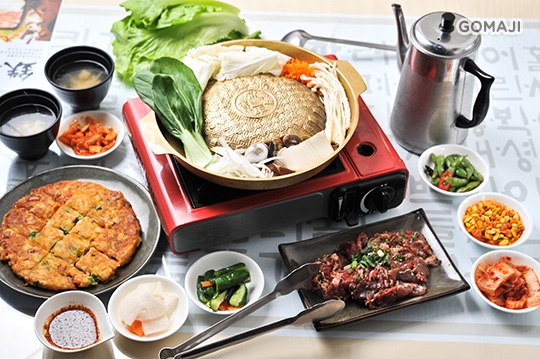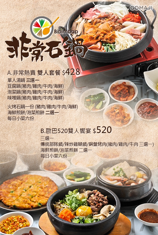 單人湯鍋:豆腐鍋(豬肉/雞肉/牛肉/海鮮)/泡菜鍋(豬肉/雞肉/牛肉/海鮮)/味噌鍋(豬肉/雞肉/牛肉/海鮮) 三選一 + 火烤石鍋一份(豬肉/雞肉/牛肉/海鮮) + 海鮮煎餅/泡菜煎餅 二選一 + 每日小菜六份