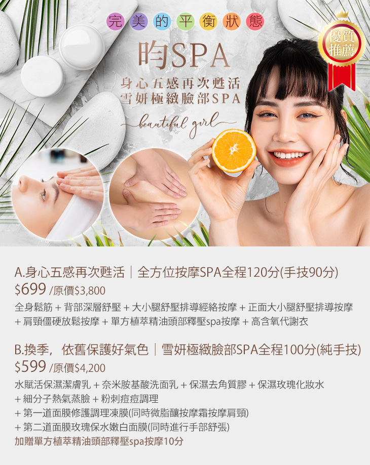 A.身心五感再次甦活|全方位按摩SPA全程120分(手技90分) / B.換季,依舊保護好氣色|雪妍極緻臉部SPA全程100分(純手技)