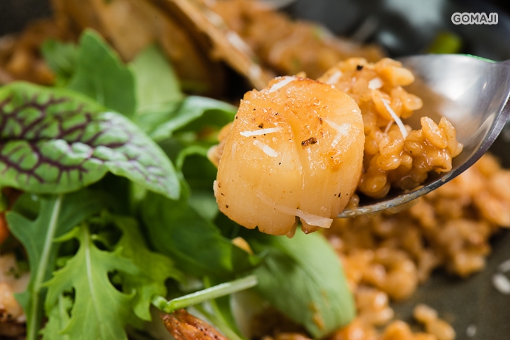 香氣破表的嫩煎干貝鮮蝦海鮮醬燉飯,店家用鮮蝦熬煮出的醬汁作為燉飯基底,與新鮮可口的海鮮佐料作搭配,吃下的每一口,彷彿置身在大海中快樂悠游 ~