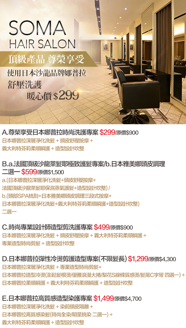 A.尊榮享受日本娜普拉時尚洗護專案 / B.a.法國頂級沙龍萊髮耶極致護髮專案/b.日本雅美娜頭皮調理 二選一 / C.時尚專業設計師造型剪洗護專案 / D.日本娜普拉彈性冷燙剪護造型專案(不限髮長) / E.日本娜普拉高質感造型染護專案