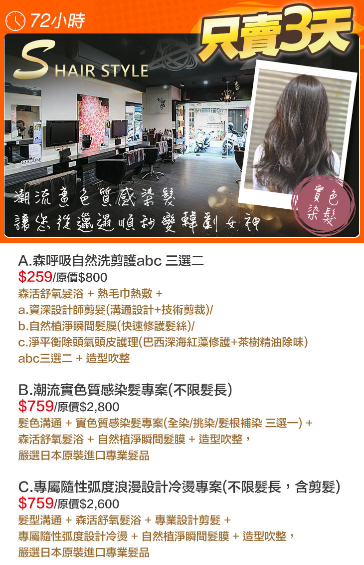 A.森呼吸自然洗剪護abc 三選二 / B.潮流實色質感染髮專案(不限髮長) / C.專屬隨性弧度浪漫設計冷燙專案(不限髮長,含剪髮)
