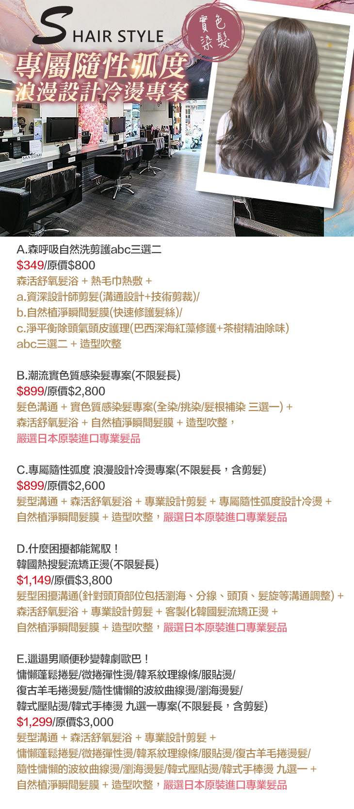 A.森呼吸自然洗剪護abc三選二 / B.潮流實色質感染髮專案(不限髮長) / C.專屬隨性弧度 浪漫設計冷燙專案(不限髮長,含剪髮) / D.什麼困擾都能駕馭!韓國熱搜髮流矯正燙(不限髮長) / E.邋遢男順便秒變韓劇歐巴!慵懶蓬鬆捲髮/微捲彈性燙/韓系紋理線條/服貼燙/復古羊毛捲燙髮/隨性慵懶的波紋曲線燙/瀏海燙髮/韓式壓貼燙/韓式手棒燙 九選一專案(不限髮長,含剪髮)