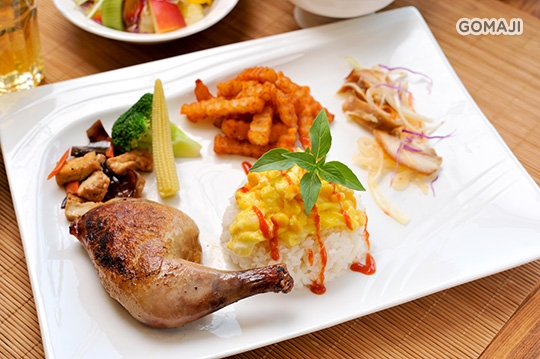 (烤雞腿 白飯 滑蛋 薯條 田園沙拉 時令蔬菜 湯品 飲料)