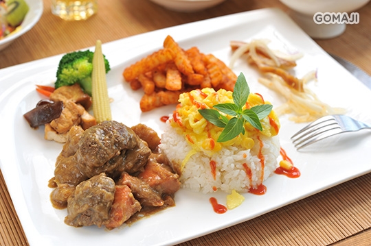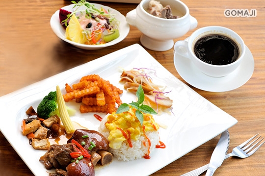 (咖哩牛肉 白飯 滑蛋 薯條 田園沙拉 時令蔬菜 湯品 飲料)