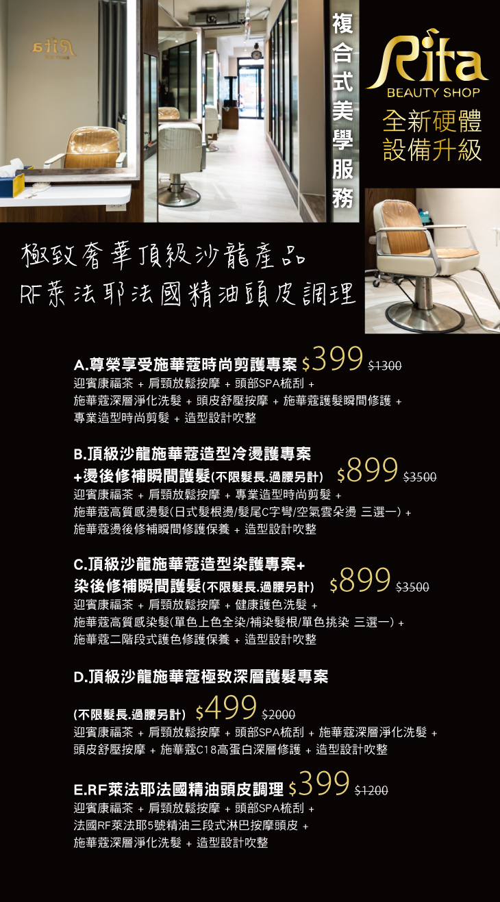 Rita Beauty Shop擁有專業造型技術,讓你擁有倍受呵護的舒活體驗,服務品質佳。而時尚、簡潔、明亮的空間 ,乾淨又寬敞,完全不會有任何一絲壓迫感。專業設計師注重溝通 ,純粹為了愛護您的髮絲,堅持選用高品質頂級沙龍產品,打造出專屬您的完美造型!