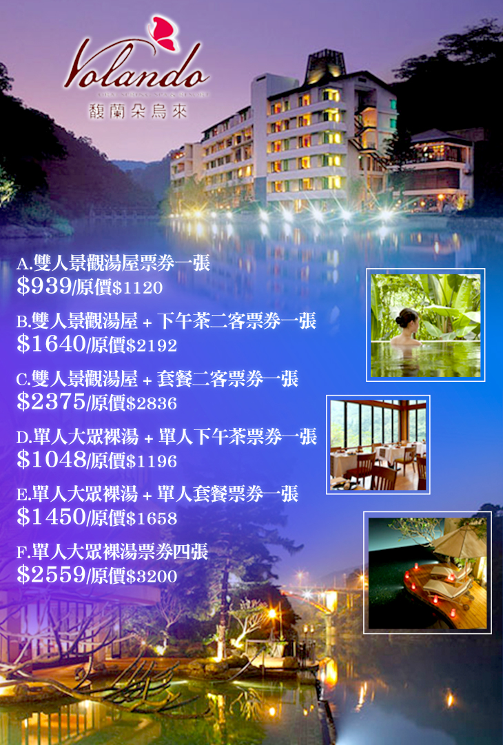 A.雙人景觀湯屋票券一張 / B.(雙人景觀湯屋+下午茶二客票券一張) / C.(雙人景觀湯屋+套餐二客票券一張) / D.(單人大眾裸湯+單人下午茶票券一張) / E.(單人大眾裸湯+單人套餐票券一張) / F.單人大眾裸湯票券四張
