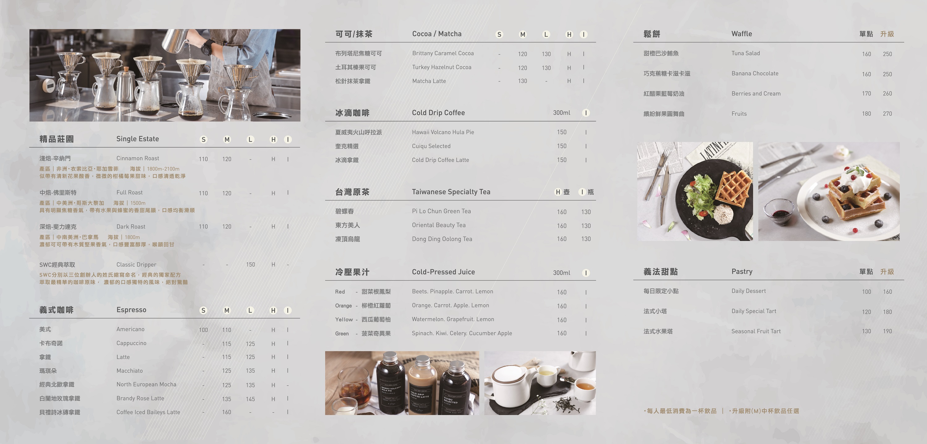以烘焙程度區別,由烘豆師依照季節選擇生豆做適當的烘焙。淺焙的花果酸香,口感清新明亮,中焙可嚐出近似榛果、柑橘與水果茶般的滑順,而深焙帶有焦糖與巧克力味,尾韻甘醇。以手沖的方式,帶出咖啡最原始純粹的味道。