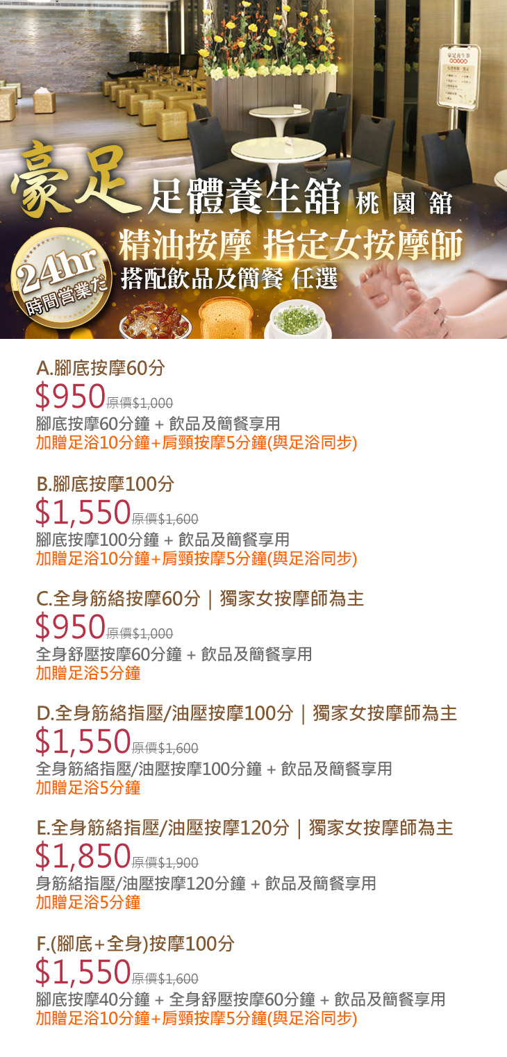 A.腳底按摩60分 / B.腳底按摩100分 / C.全身筋絡按摩60分|獨家女按摩師為主 / D.全身筋絡指壓/油壓按摩100分|獨家女按摩師為主 / E.全身筋絡指壓/油壓按摩120分|獨家女按摩師為主 / F.(腳底+全身)按摩100分