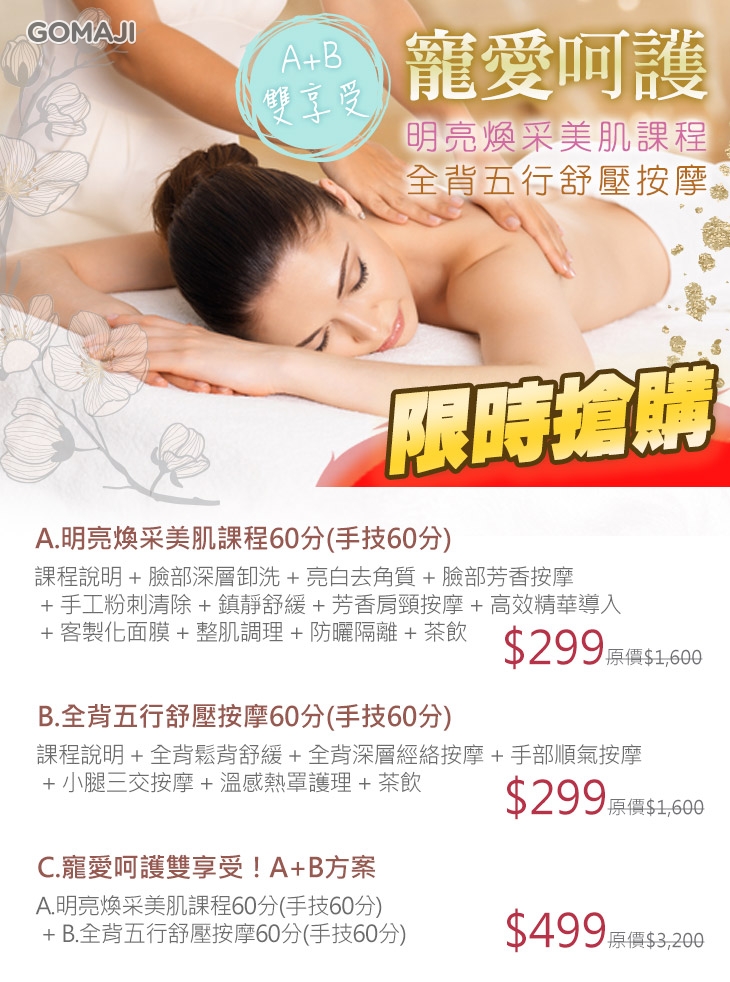 〈A.明亮煥采美肌課程60分(手技60分) + B.全背五行舒壓按摩60分(手技60分)〉