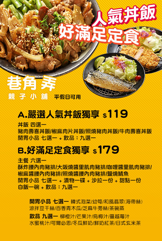 丼飯:豬肉壽喜丼飯/椒麻肉片丼飯/照燒豬肉丼飯/牛肉壽喜丼飯 四選一 + 開胃小品:韓式泡菜/幼筍/和風翡翠(海帶絲)/涼拌豆干絲/百香青木瓜/芝麻牛蒡絲/茶碗蒸 七選一 + 飲品:柳橙汁/芒果汁/烏梅汁/蔓越莓汁/水蜜桃汁/可爾必思/冬瓜鮮奶/鮮奶紅茶/日式玄米茶 九選一
