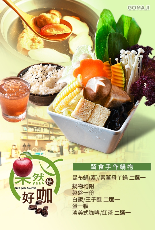 一處城市旅行者的休憩聚所,歡迎來訪【果然是好咖】!在這裡主打時蔬健康新概念的素食料理,為麻吉送上蔬菜果汁、早午餐、輕食、咖啡等!這回適逢週年慶期間,特別與GOMAJI推出蔬食手作鍋物單人鍋(昆布鍋(素)/素薑母ㄚ鍋2選1),限時超值優惠只要199元!精心打造的樂活饗食空間,每個角落都是別有一番趣味,飽餐之餘還能與三五好友到二樓的透明地板自拍打卡喔! 昆布鍋(素) 素薑母ㄚ鍋 菜盤 / 王子麵