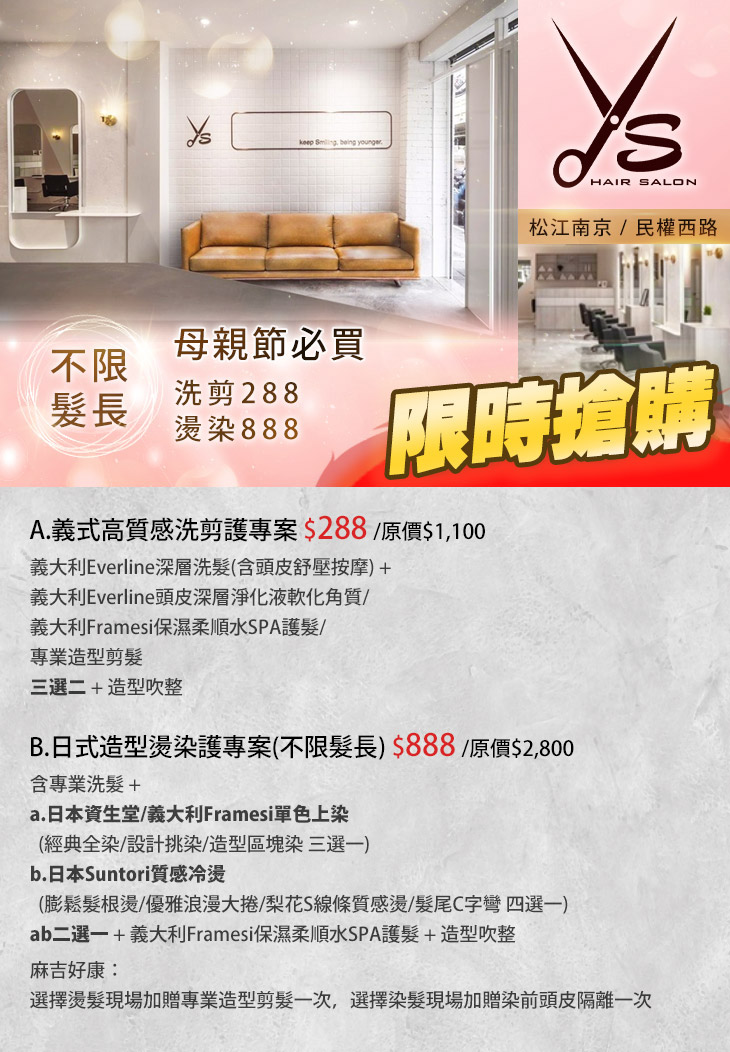 Ys Hair Salon有著簡約明亮的空間設計,雖然以簡單自然為主要風格,讓顧客擁有亮麗的髮型之外,也能享受專業的服務,在過程中享受身心靈的全然放鬆!
