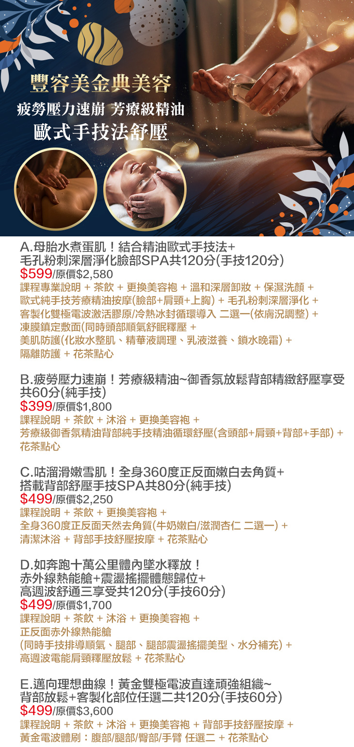 A.母胎水煮蛋肌!結合精油歐式手技法+毛孔粉刺深層淨化臉部SPA共120分(手技120分)/B.疲勞壓力速崩!芳療級精油~御香氛放鬆背部精緻舒壓享受共60分(純手技)/C.咕溜滑嫩雪肌!全身360度正反面嫩白去角質+搭載背部舒壓手技SPA共80分(純手技)/D.如奔跑十萬公里體內墜水釋放!赤外線熱能艙+震盪搖擺體態歸位+高週波舒通三享受共120分(手技60分)/E.邁向理想曲線!黃金雙極電波直達頑強組織~背部放鬆+客製化部位任選二共120分(手技60分)