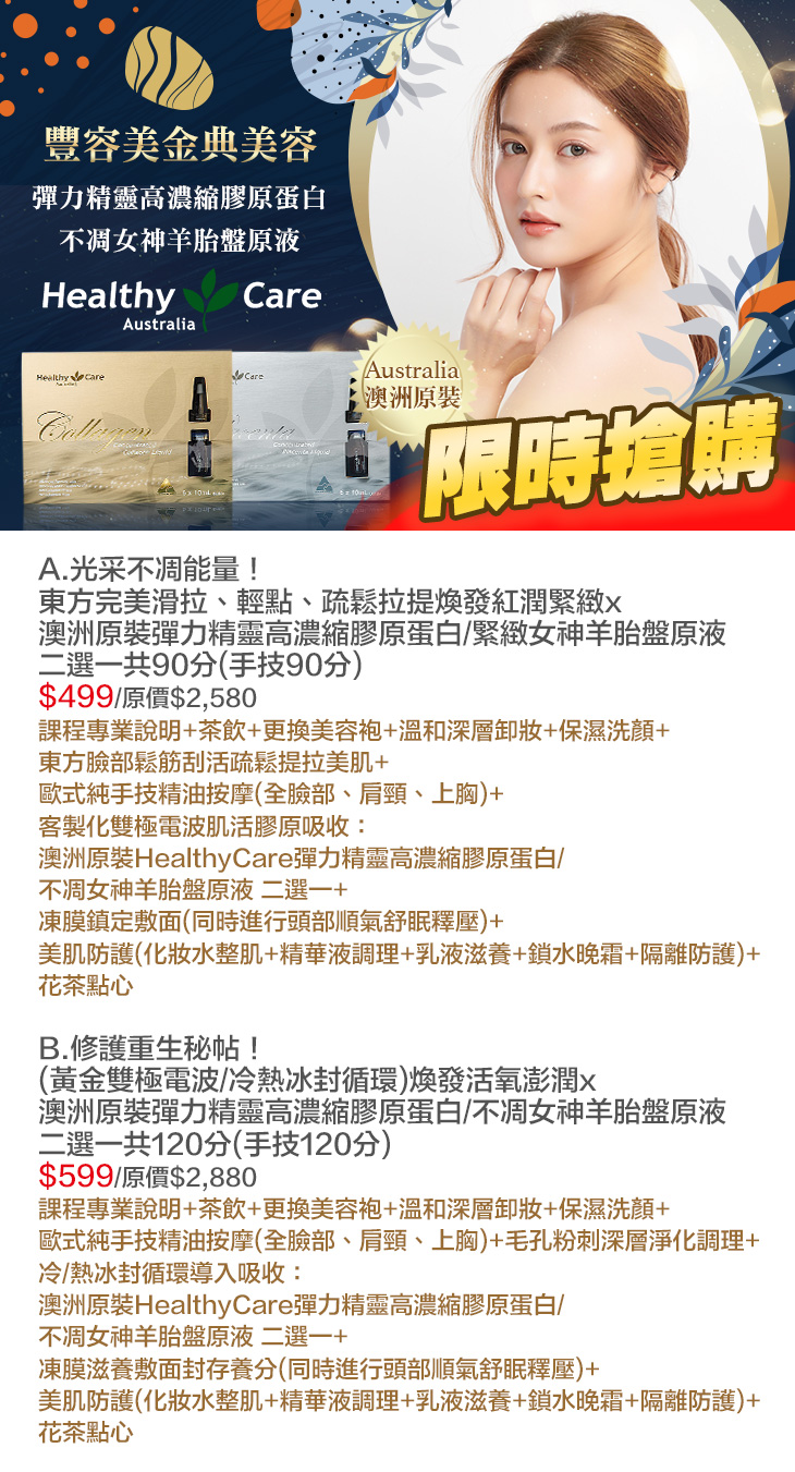 A.光采不凋能量!東方完美滑拉、輕點、疏鬆拉提煥發紅潤緊緻x澳洲原裝彈力精靈高濃縮膠原蛋白/緊緻女神羊胎盤原液 二選一共90分(手技90分) / B.修護重生秘帖!(黃金雙極電波/冷熱冰封循環)煥發活氧澎潤x澳洲原裝彈力精靈高濃縮膠原蛋白/不凋女神羊胎盤原液 二選一共120分(手技120分)
