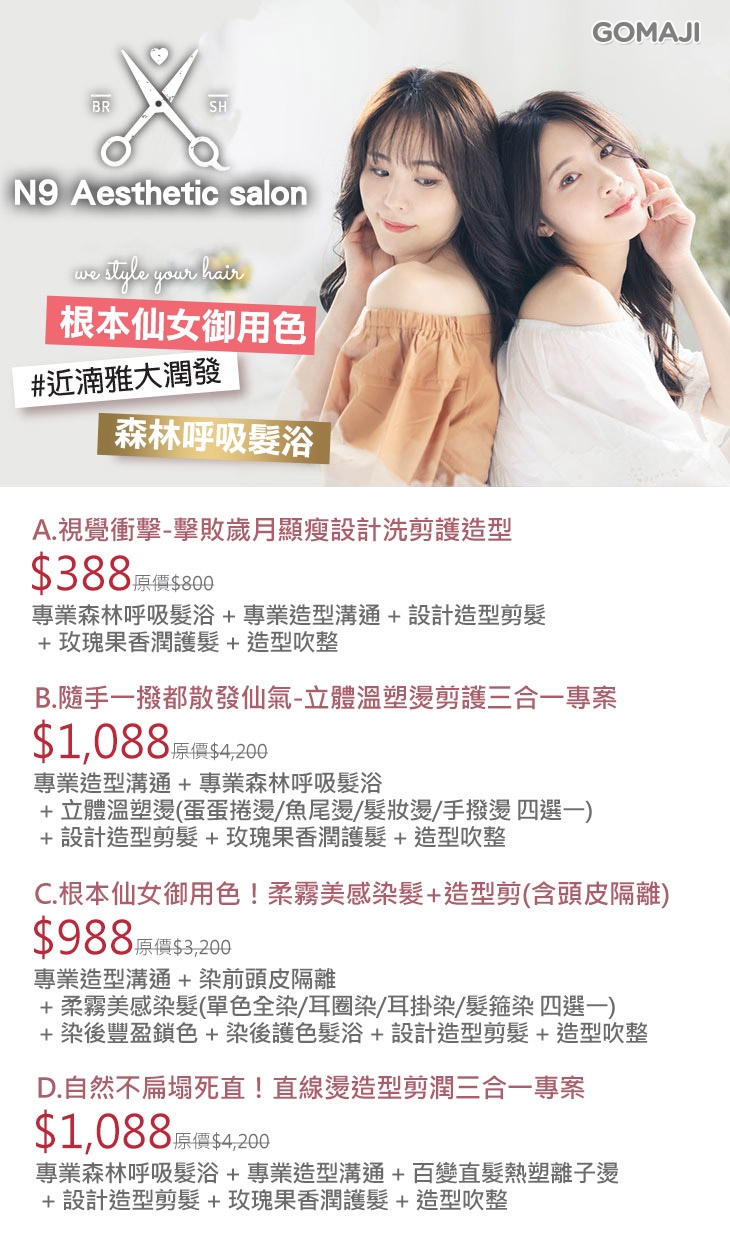 A.視覺衝擊-擊敗歲月顯瘦設計洗剪護造型 / B.隨手一撥都散發仙氣-立體溫塑燙剪護三合一專案 / C.根本仙女御用色!柔霧美感染髮+造型剪(含頭皮隔離) / D.自然不扁塌死直!直線燙造型剪潤三合一專案