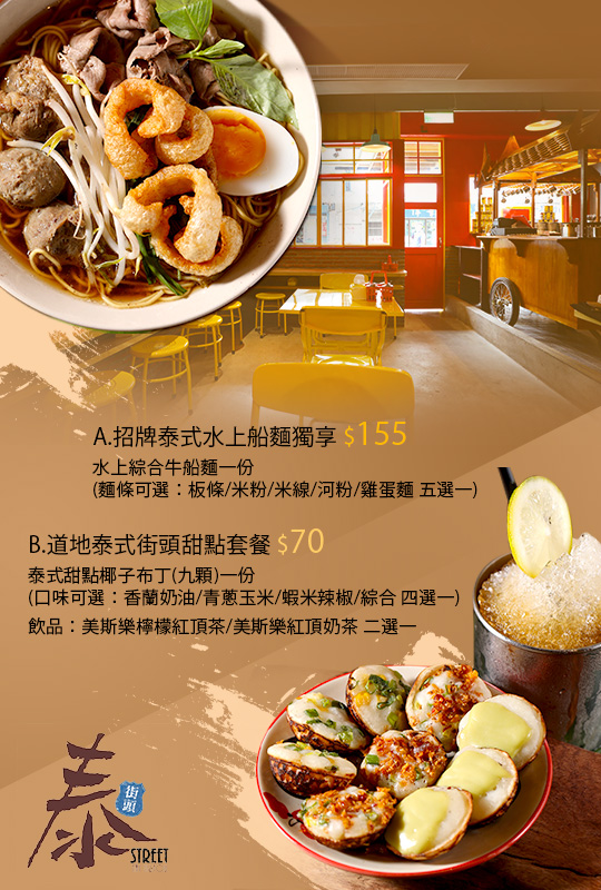 「一家店,一條街」六個字,貫穿了〝泰街頭〞經營根本。這是一家專賣泰式街頭小吃的領導品牌。短短二年,便開了分店 (二店),迅速在台電大樓周邊竄起,致力將店面打造泰國當地街頭小吃的經典。其中,以船麵具代表之一,幾乎是泰國的平民小吃。