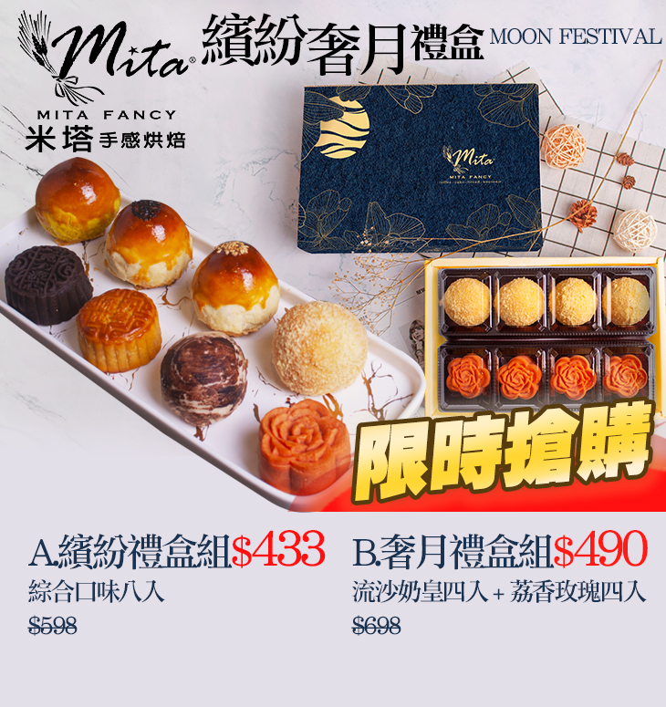 今年中秋,就讓【米塔手感烘焙】給您最好的!質感、精緻的禮盒包裝中,精選八種不同口味的月餅,手作的職人風味,甜而不膩,充滿手工的溫度與熟練的功夫,為您點綴繽紛、多樣的中秋色彩!
