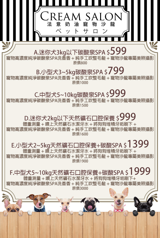 A.迷你犬3kg以下碳酸泉SPA / B.小型犬3~5kg碳酸泉SPA / C.中型犬5~10kg碳酸泉SPA / D.迷你犬2kg以下天然礦石口腔保養+碳酸SPA / E.小型犬2~5kg天然礦石口腔保養+碳酸SPA / F.中型犬5~10kg天然礦石口腔保養+碳酸SPA