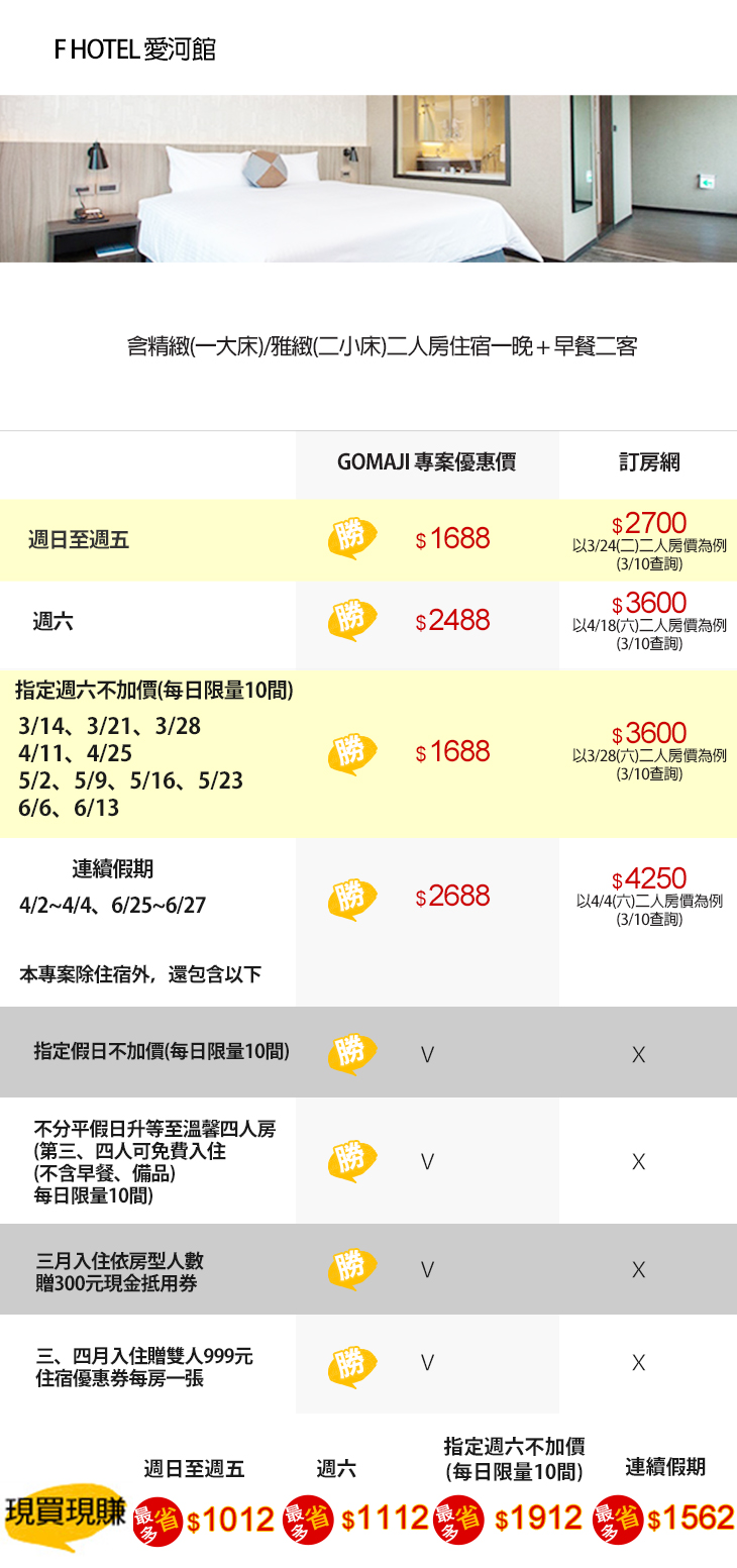 ★ 好日子快搶房→指定週六不加價:3/14、3/21、3/28、4/11、4/25、5/2、5/9、5/16、5/23、6/6、6/13 (每日限量10間)!