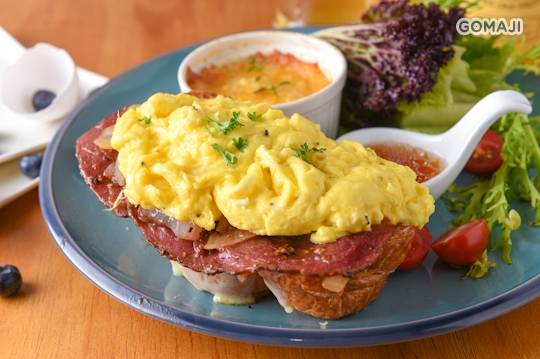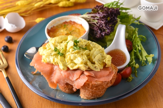 橘紅瑰麗的挪威煙燻鮭魚透著海味的甘美清甜,佐以金黃炒蛋與酥香可頌,澎湃饗宴就等你來體驗!