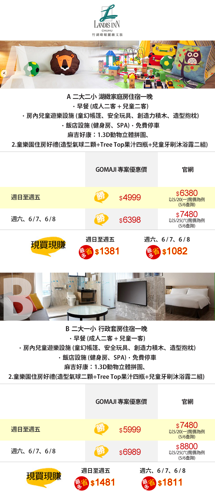 貼心爲孩子準備了超豐富的玩具選擇,無論是童幻帳篷、安全玩具、創造力積木、造型抱枕等應有盡有,在房內即可擁有專屬的歡樂天地,共享天倫之樂!