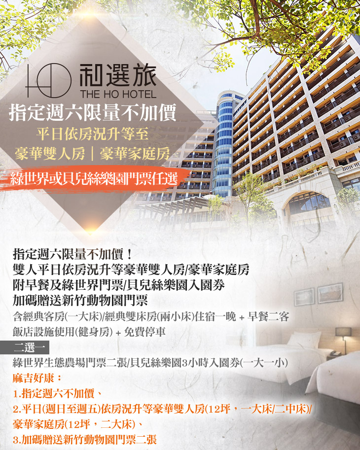 ★ 附翌日豐盛早餐,門票可選擇綠世界門票二張或貝兒絲樂園一大一小入園券,再加碼送新竹動物園門票,親子夏日輕旅行正是時候。