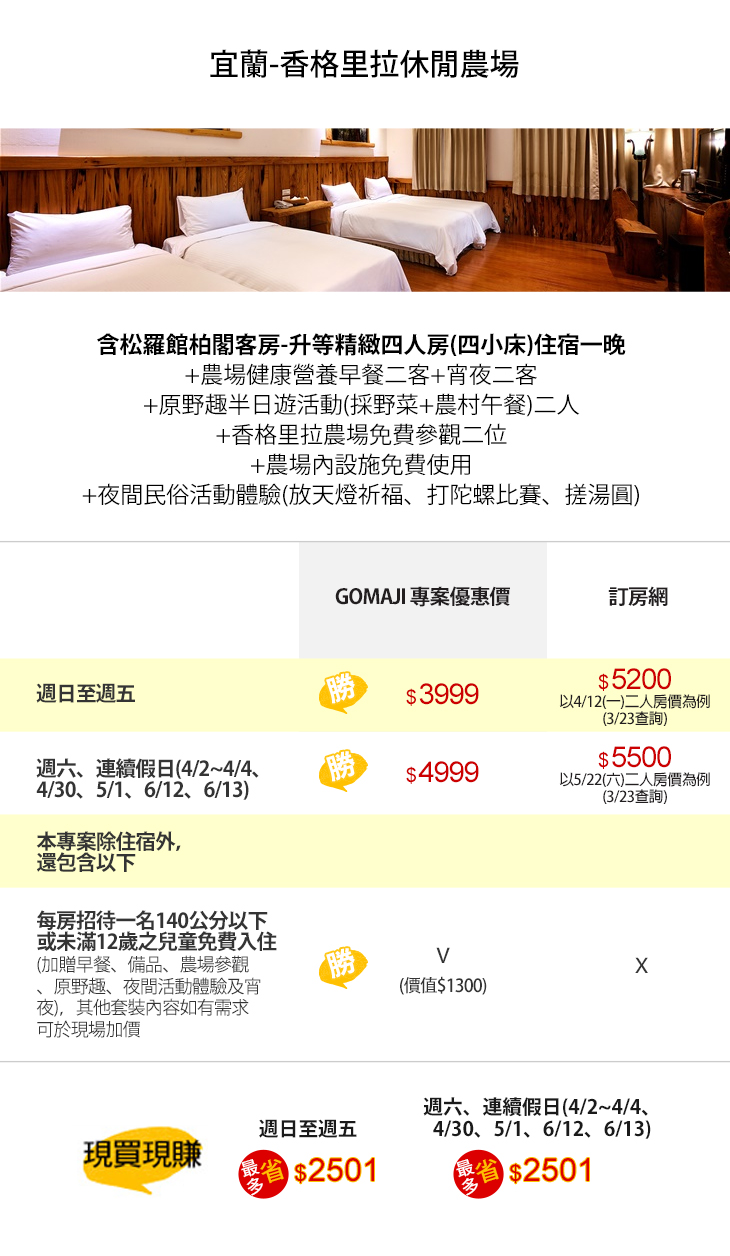 ★ 2大加贈1小(140公分以下或未滿12歲),升等松羅館柏閣客房-精緻四人房(四小床),充滿木頭香的森林客房讓你一夜好眠,搭配超好玩一站式農場體驗!