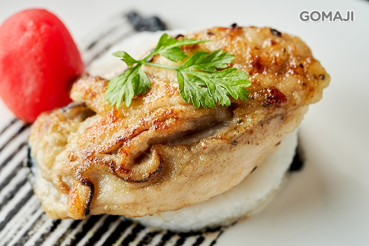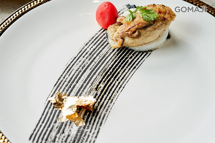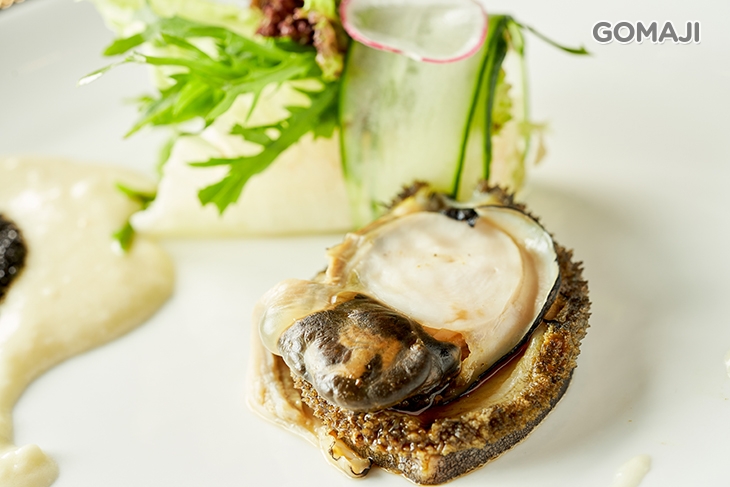大安9號的是採用像手心一樣大的南非活鮑魚,主廚用新鮮昆布和台南二層鹽覆蓋於鮮活南非鮑魚上,使用日式傳統岩鹽蒸法,把熱氣悶在鐵板燒蓋下,瞬間高溫可衝上180度,在高溫迅速料理出來的活鮑魚口感,軟嫩Q彈。