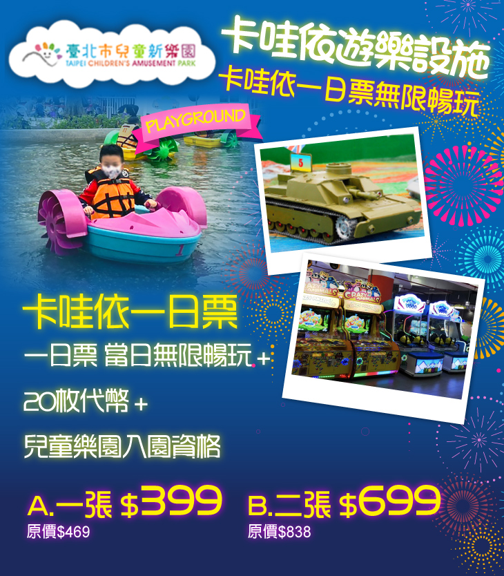 兒童新樂園卡哇依遊樂設施為兒童打造有趣、繽紛的歡樂天地!這裡設有教練小汽車、戰火金剛、手搖船、勇闖侏儸紀、F1狂飆飛車、森林舞會、瘋狂甜甜圈、坦克大戰、歡樂碰碰船、迷你卡丁十大設施,設施都定期檢修,也會有工作人員在一旁操作,安全上爸媽們絕對可以放心!在這裡聽著笑鬧聲此起彼落,孩子快樂放電,爸媽也能與孩子分享喜悅,現在就大手牽小手一同玩耍共度天倫樂吧!