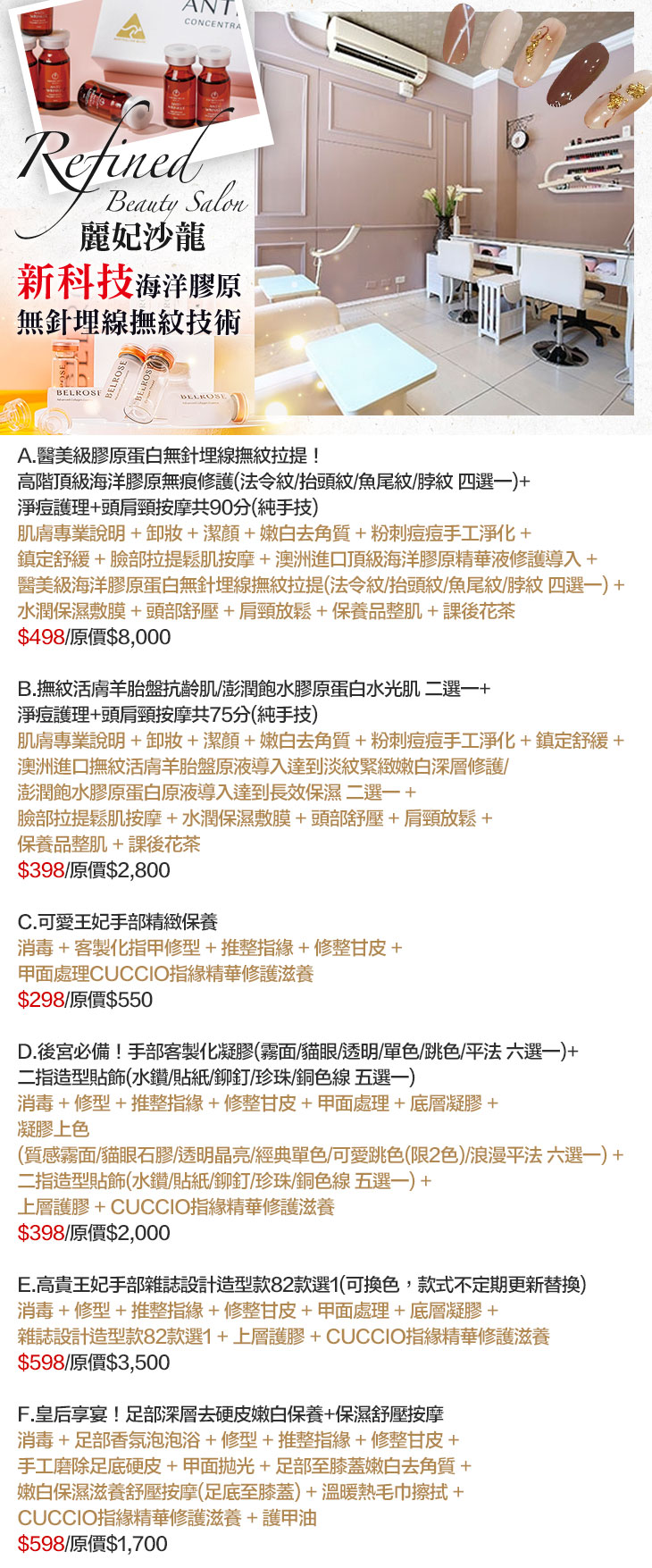A.醫美級膠原蛋白無針埋線撫紋拉提!高階頂級海洋膠原無痕修護四選一+淨痘護理+頭肩頸按摩共90分/B.撫紋活膚羊胎盤抗齡肌/澎潤飽水膠原蛋白水光肌 二選一+淨痘護理+頭肩頸按摩共75分(純手技)/C.可愛王妃手部精緻保養/D.後宮必備!手部客製化凝膠(霧面/貓眼/透明/單色/跳色/平法 六選一)+二指造型貼飾(水鑽/貼紙/鉚釘/珍珠/銅色線 五選一)/E.高貴王妃手部雜誌設計造型款82款選1(可換色,款式不定期更換)/F.皇后享宴!足部深層去硬皮嫩白保養+保濕舒壓按摩