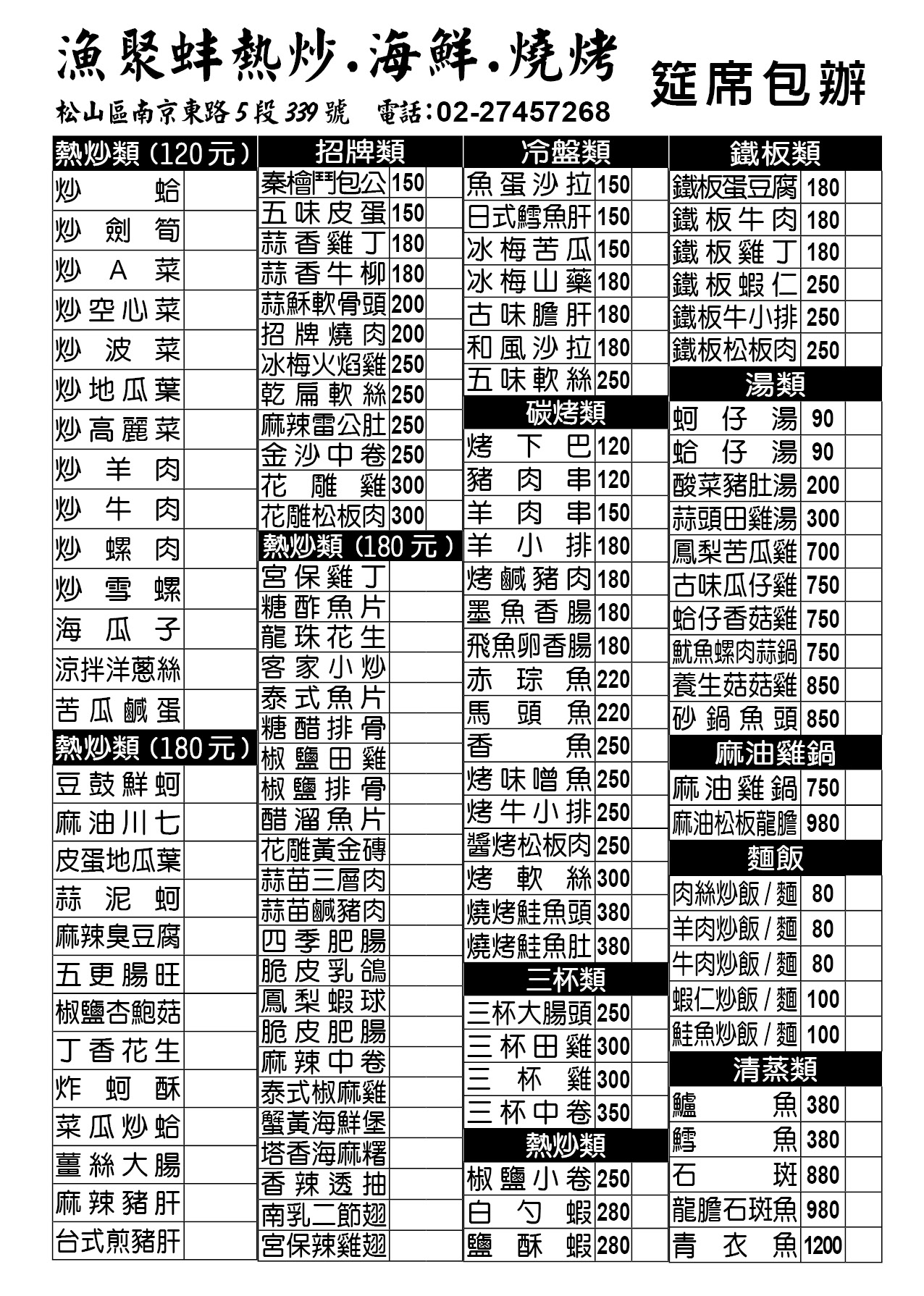 位於台北市松山區南京東路五段 339 號 1 樓的漁聚蚌 熱炒.海鮮.燒烤,鄰近捷運南京三民站四號出口,交通便利,專營新鮮現作的熱炒、清甜到不行的海鮮、還有燒烤唷!料理多元豐富,肯定不會讓你敗興而歸!