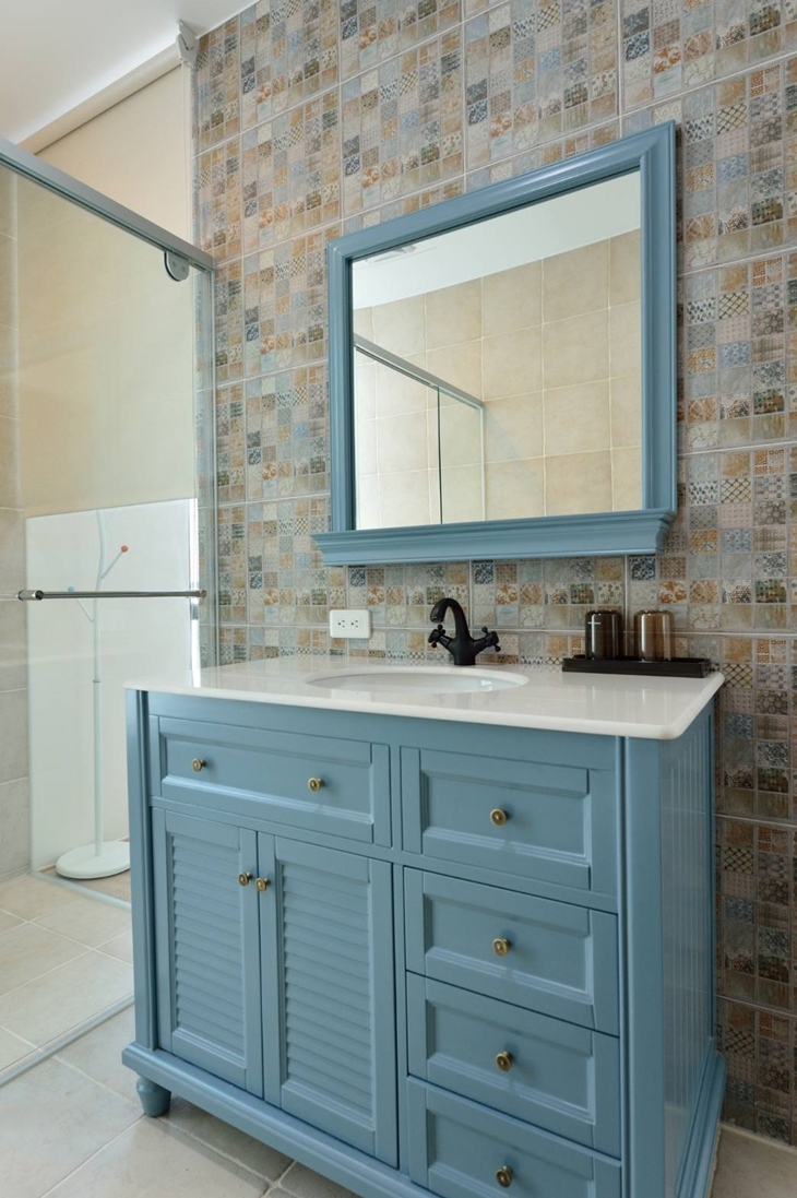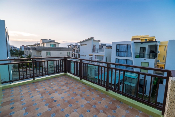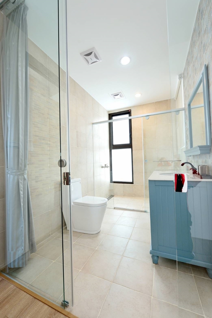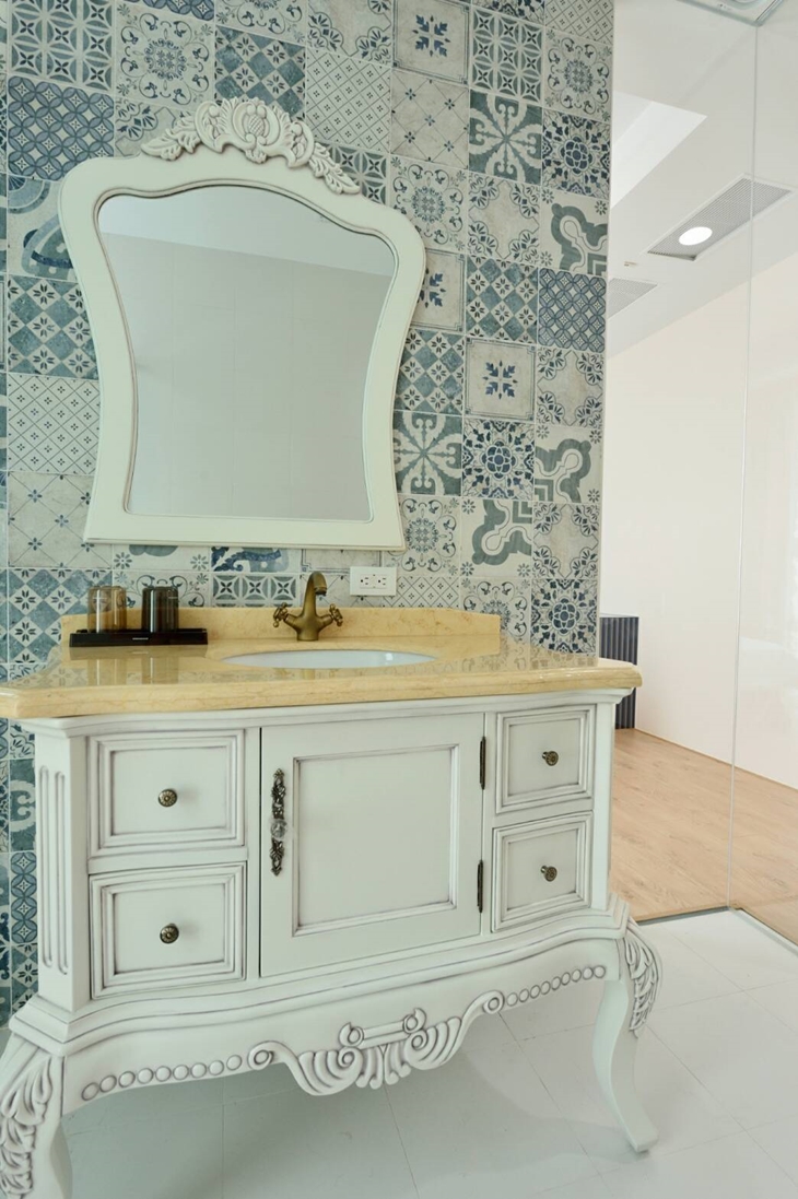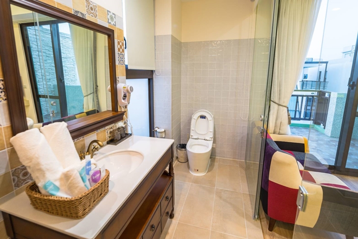 房內以素雅的粉色系為主色基調,衛浴空間以潔白浴櫃,溫暖圖騰的復古磁磚拼貼,打造出南歐風氣息的衛浴空間,並設有小型露台迎入溫暖的陽光與海風,以最細心與質感的設計概念,展露民宿貼心與認真的一面。
