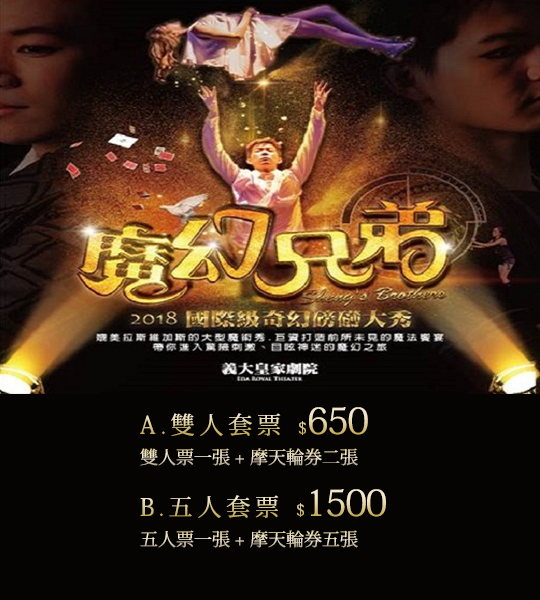 耗資數億打造的豪華皇家劇院,欣賞屢獲外交部邀請,世界各地巡迴演出的國際級天才魔幻兄弟,全長 50 分鐘的奇幻旅程,超乎想像的震撼演出,營造的視覺效果,屏息期待!