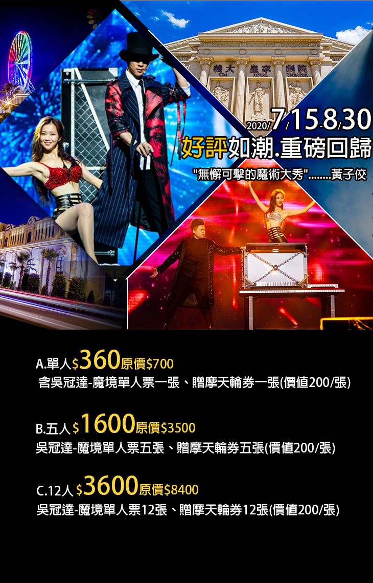 火辣刺激、目眩神迷、奇幻魔技,年度票房冠軍魔術秀,好評如潮、重磅回歸,保證更精彩、更緊湊!台灣新一代大型幻術明星 吳冠達,獨特舞台魅力令人激賞! 首創結合/歌曲/舞蹈推出台灣史上首支魔術 MV,2013 與天后蔡依林攜手合作魔幻音樂之旅,並擔任第 24 屆金曲獎開場演出嘉賓,成為台灣魔術史上首位登上金曲殿堂的魔術師,冠達更身兼許多天王天后御用魔術師,足跡遍及全世界,為台灣魔術界未來最閃耀的一顆巨星!