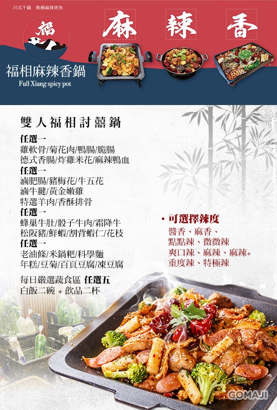 愛吃麻辣火鍋的麻吉照過來!即將獻上你(妳)此生可能從未嚐過的乾式麻辣鍋!台灣麻辣香鍋第一品牌【福相麻辣香鍋】!源自四川原汁原味引進十三香麻辣鍋底醬,搭配豐富多樣的食材拌炒,形成獨一無二的風味麻辣乾鍋!這回只要440元即可讓麻吉倆享用雙人福相討囍鍋喔!