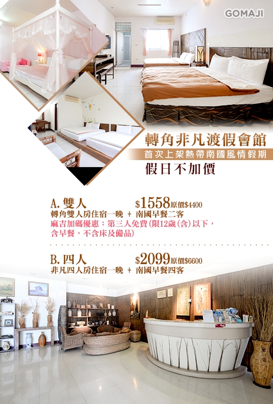 ➤麻吉加碼優惠:第三人免費(限12歲(含)以下,含早餐,不含床及備品)