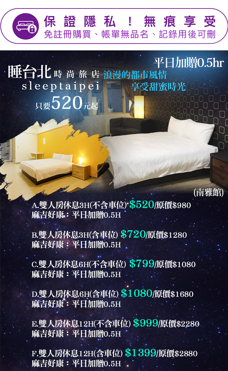 座落於新板特區中心,擁有十多種不同主題套房,設備齊全,在繁華的城市中提供一處能喘口氣、好好歇息的空間,讓您享有高度隱私,優質休息專案,快點來搶購!