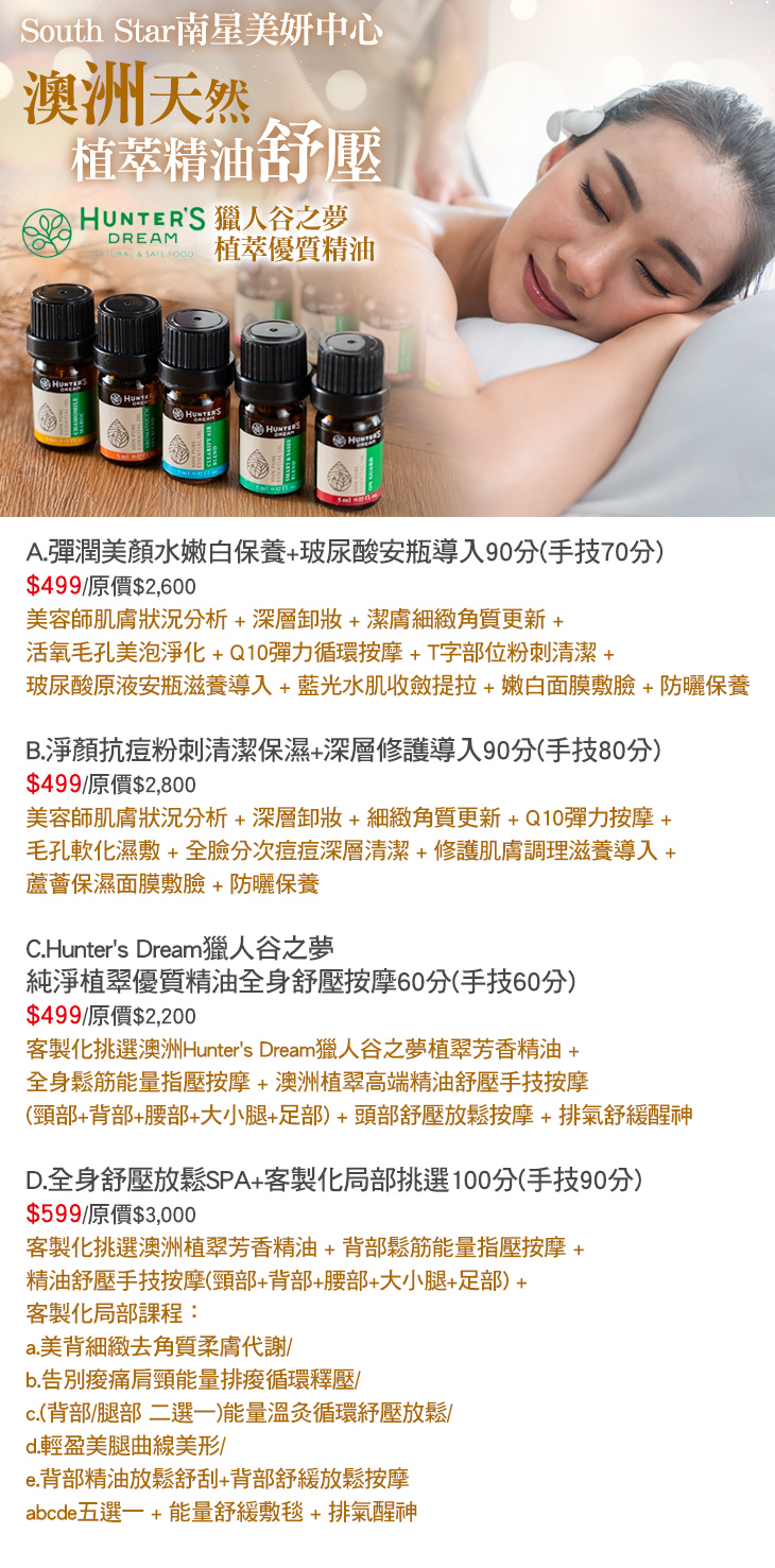 A.彈潤美顏水嫩白保養+玻尿酸安瓶導入90分(手技70分) / B.淨顏抗痘粉刺清潔保濕+深層修護導入90分(手技80分) / C.Hunter's Dream獵人谷之夢純淨植翠優質精油全身舒壓按摩60分(手技60分) / D.全身舒壓放鬆SPA+客製化局部挑選100分(手技90分)