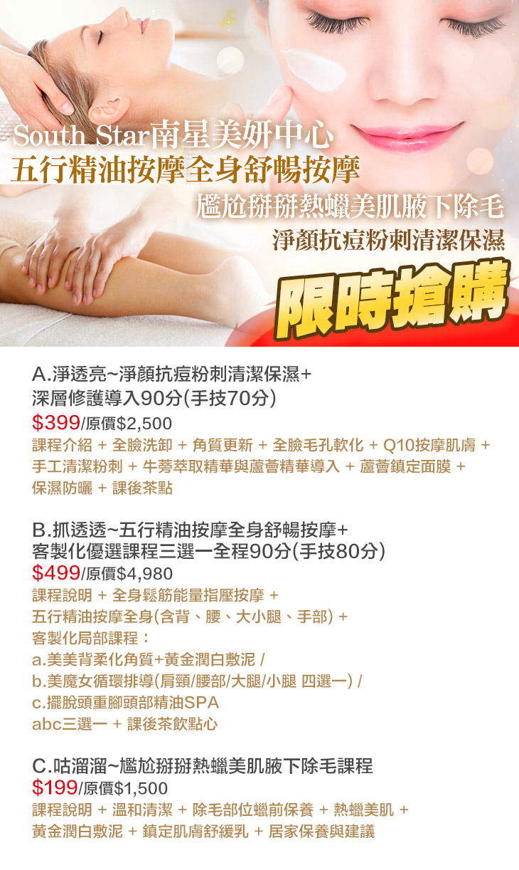 A.淨透亮~淨顏抗痘粉刺清潔保濕+深層修護導入90分(手技70分) / B.抓透透~五行精油按摩全身舒暢按摩+客製化優選課程三選一全程90分(手技80分) / C.咕溜溜~尷尬掰掰熱蠟美肌腋下除毛課程