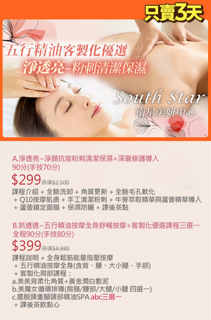 A.淨透亮~淨顏抗痘粉刺清潔保濕+深層修護導入90分(手技70分) / B.抓透透~五行精油按摩全身舒暢按摩+客製化優選課程三選一全程90分(手技80分)
