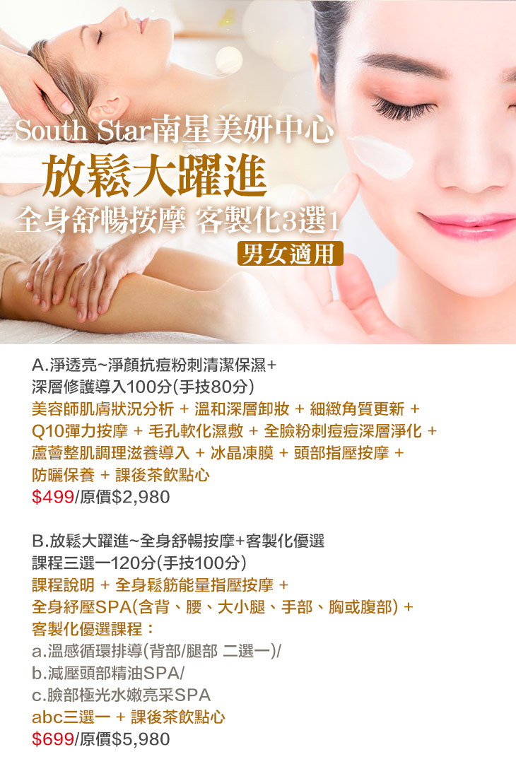 A.淨透亮~淨顏抗痘粉刺清潔保濕+深層修護導入100分(手技80分) / B.放鬆大躍進~全身舒暢按摩+客製化優選課程三選一120分(手技100分)