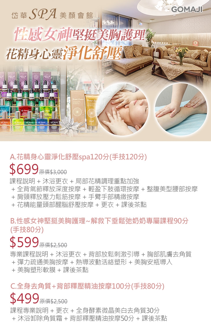 A.花精身心靈淨化舒壓spa120分(手技120分) / B.性感女神堅挺美胸護理~解救下垂鬆弛奶奶專屬課程90分(手技80分) / C.全身去角質+背部釋壓精油按摩100分(手技80分)