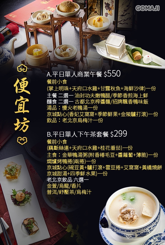 餐前小食(掌上明珠+天府口水雞+甘露秋魚+海鮮沙律)一份 + 主餐:油封功夫嫩鴨腿/季節香煎海上鮮 二選一 + 麵食:古都北京榨醬麵/招牌飄香鴨味飯 二選一 + 湯品:慢火老鴨湯一份 + 京城點心(香妃艾窩窩+季節鮮果+金陵驢打滾)一份 + 飲品:老北京烏梅汁一份