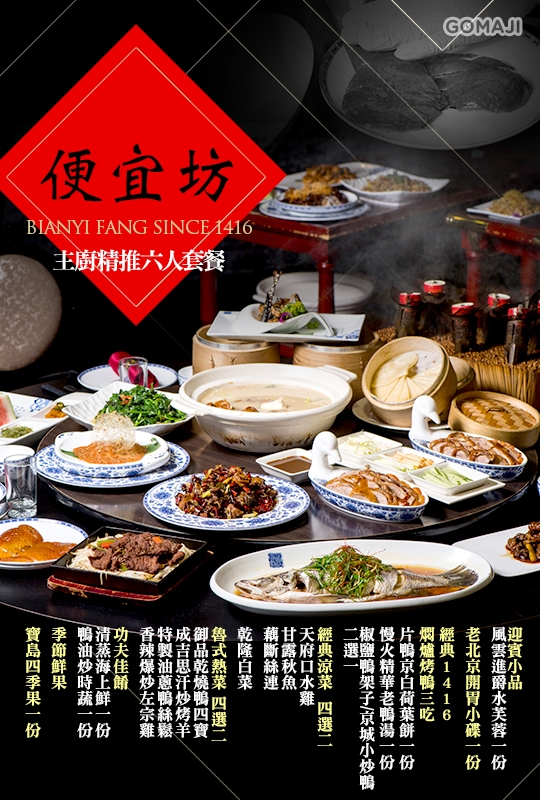 迎賓小品:風雲進爵水芙蓉一份 + 老北京開胃小碟一份 + 經典1416燜爐烤鴨三吃:片鴨京白荷葉餅一份 + 慢火精華老鴨湯一份 + 椒鹽鴨架子/京城小炒鴨 二選一 + 經典涼菜:天府口水雞/甘露秋魚/藕斷絲連/乾隆白菜 四選二 + 魯式熱菜:御品乾燒鴨四寶/成吉思汗炒烤羊/特製油蔥鴨絲鬆/香辣爆炒左宗雞 四選二 + 功夫佳餚:(清蒸海上鮮一份+鴨油炒時蔬一份) + 季節鮮果:寶島四季果一份