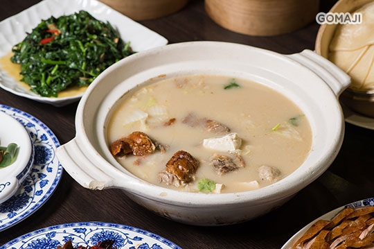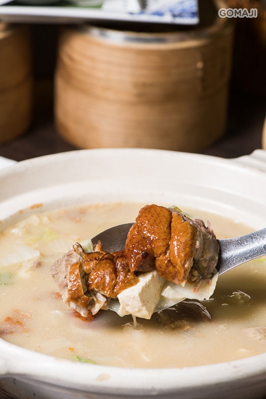 將烤鴨肉片皮後,鴨骨入湯,同時加入鴨掌豐富膠質,以大火不斷熬煮,經過三天熬製成乳白高湯,湯色濃白,味道鮮甜濃郁!