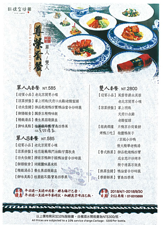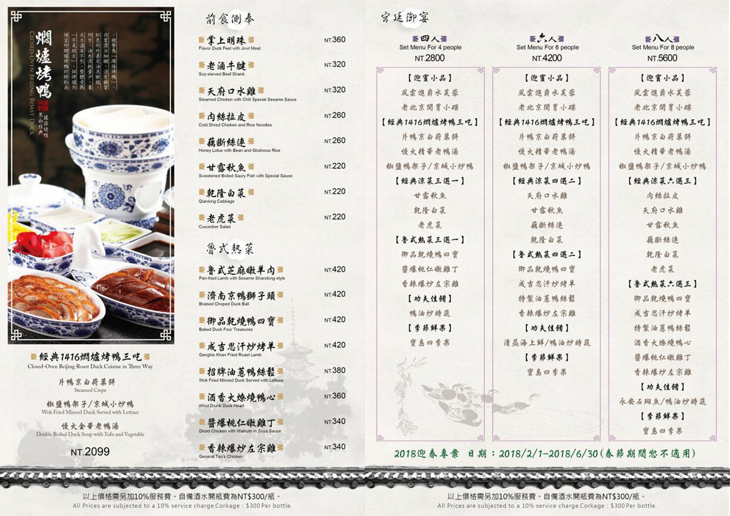 掌上明珠、天府口水雞、藕斷絲連、乾隆白菜、御品乾燒鴨四寶、成吉思汗炒烤羊、招牌油蔥鴨絲鬆