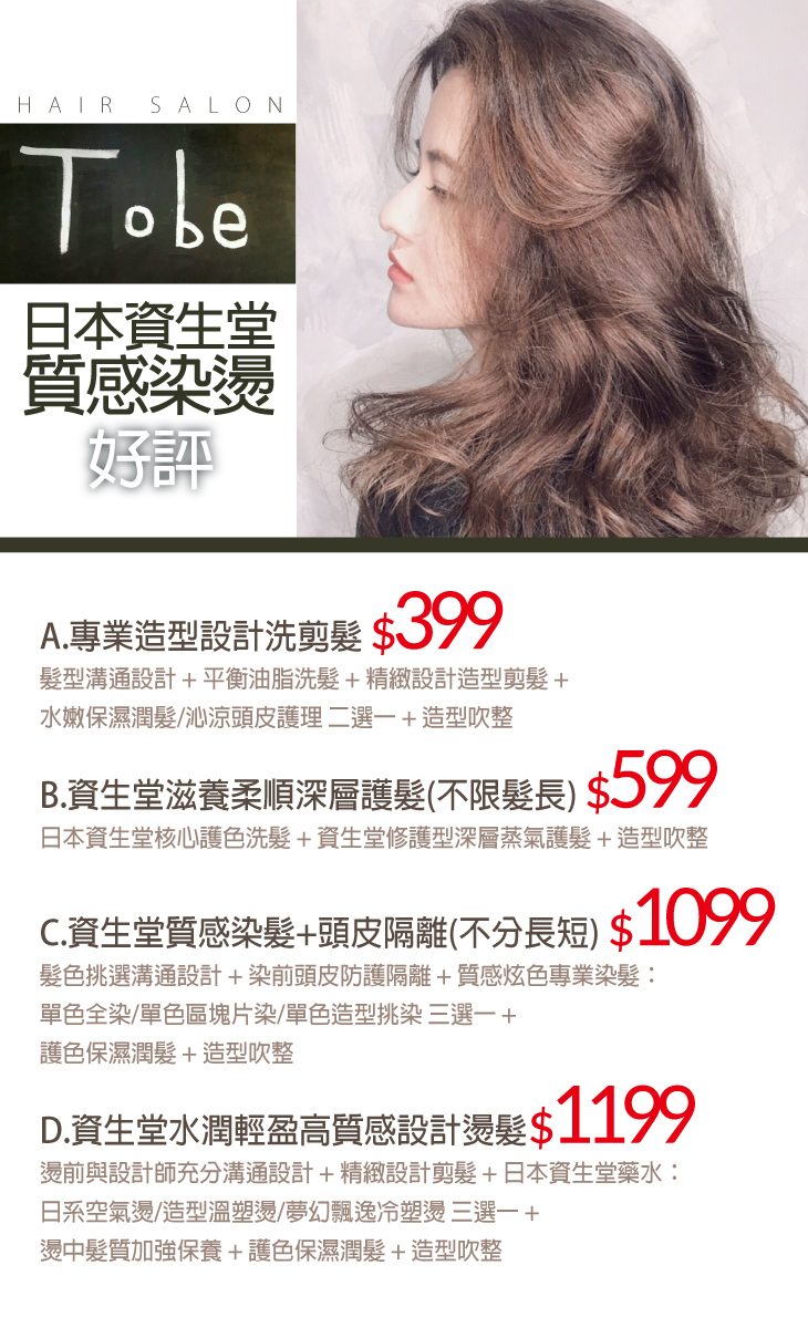 A.專業造型設計洗剪髮 / B.資生堂滋養柔順深層護髮(不限髮長) / C.資生堂質感染髮+頭皮隔離(不分長短) / D.資生堂水潤輕盈高質感設計燙髮
