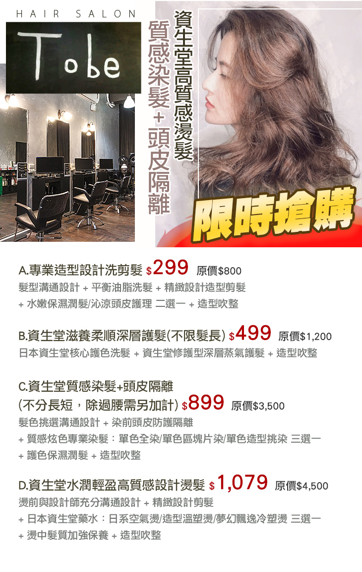 A.專業造型設計洗剪髮 / B.資生堂滋養柔順深層護髮(不限髮長) / C.資生堂質感染髮+頭皮隔離(不分長短,除過腰需另加計) / D.資生堂水潤輕盈高質感設計燙髮