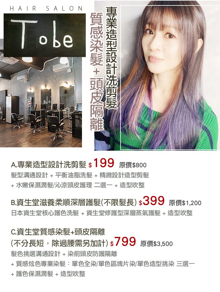 A.專業造型設計洗剪髮 / B.資生堂滋養柔順深層護髮(不限髮長) / C.資生堂質感染髮+頭皮隔離(不分長短,除過腰需另加計)